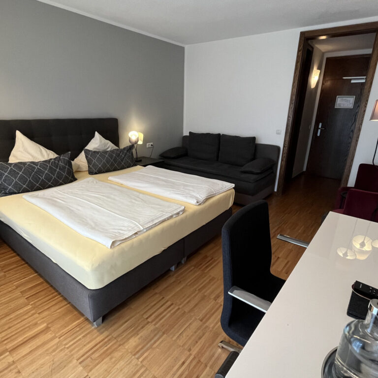 Modernes Doppelzimmer mit Massivholzboden, geräumige Dusche, WC, Föhn, Handtuchwärmer, Waschtisch mit viel Ablagefläche, Safe, Flat-TV, bequeme LED-Leselampe am Bett, Schreibtisch, elektrische Rollos sowie Balkon.